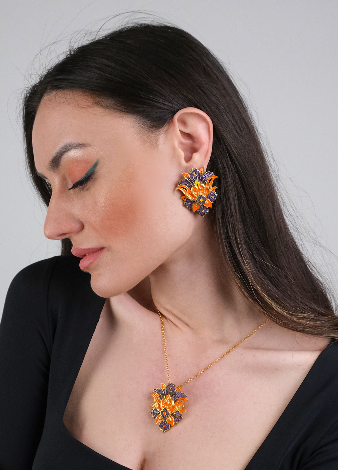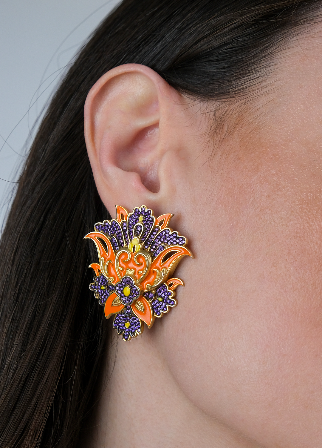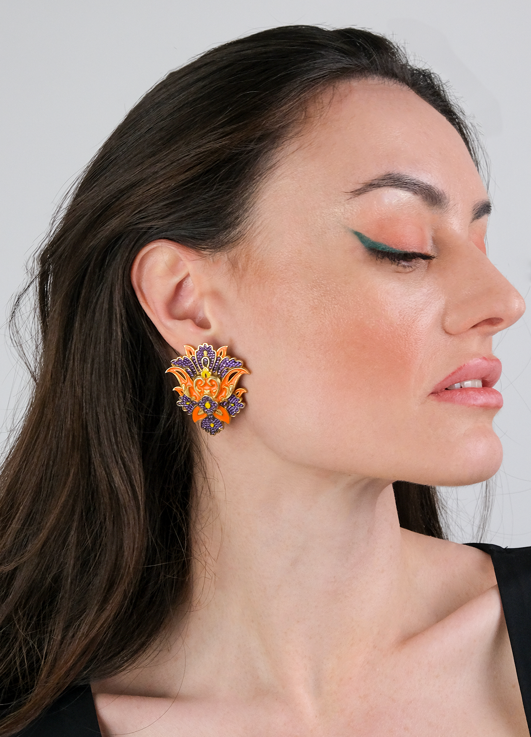 Royal World Purple Crystal Orange Enamel Crystal Earrings